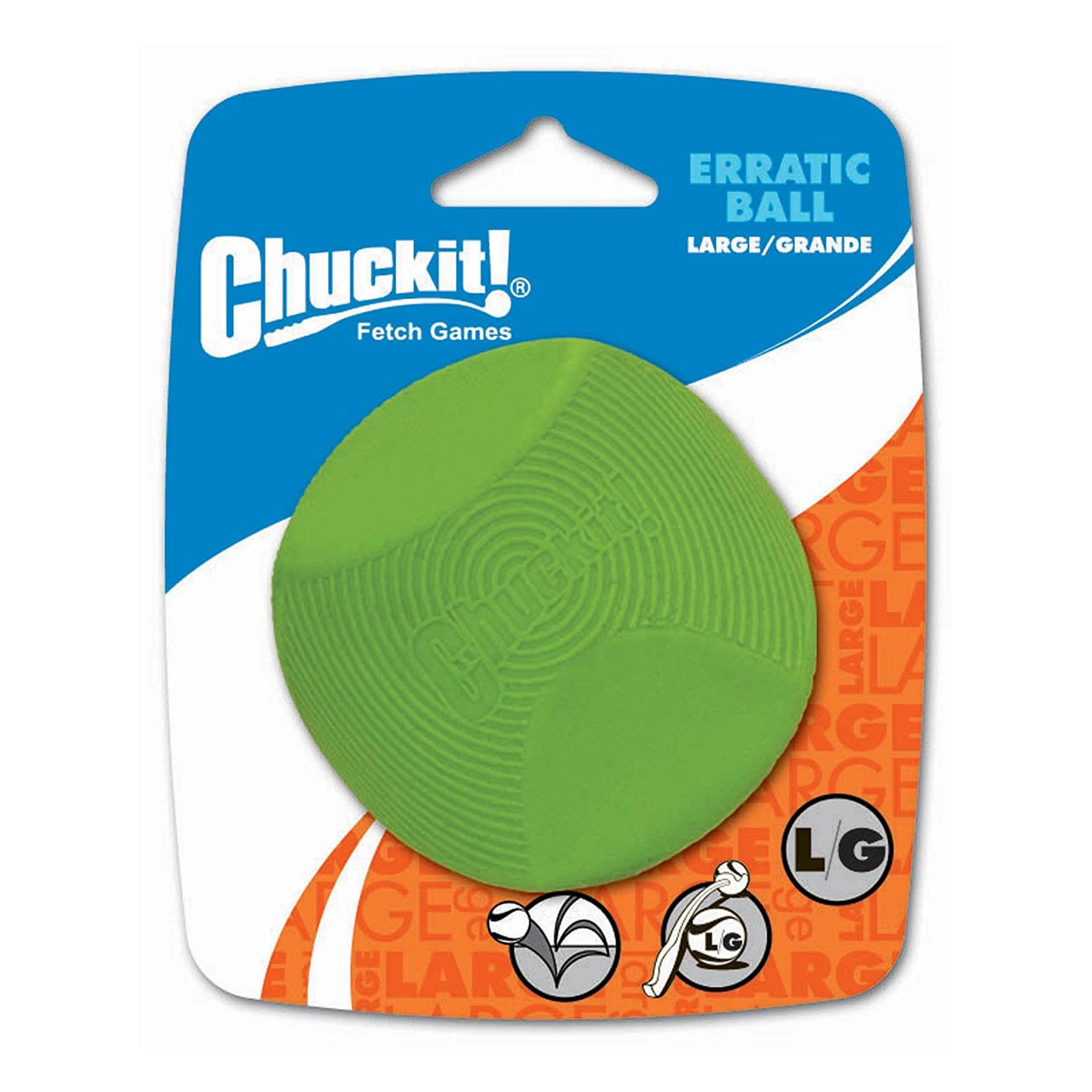 Chuckit Erratic ball loptica napravljena je od izdržljive prirodne gume. Posebno je dizajnirana s nepravilnim plohama kako bi se nepredvidivo odbijala i kotrljala, time je psima dodatno zanimljiva jer imitira plijen. Ima otvor kroz koji se može ubaciti poslastica. Dugotrajna je i jednostavno se čisti. Odgovara svim Chuckit bacačima veličine L.